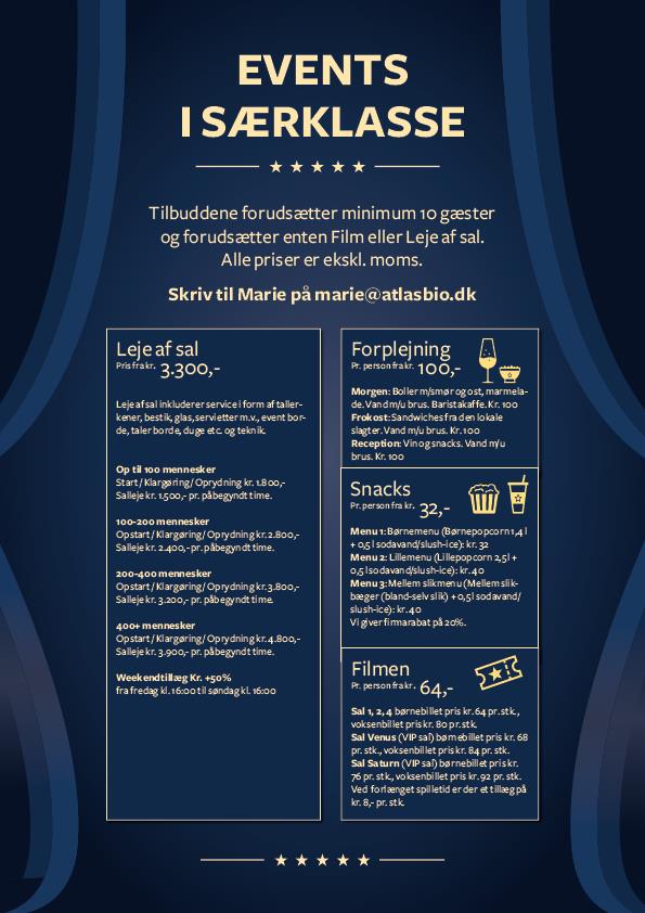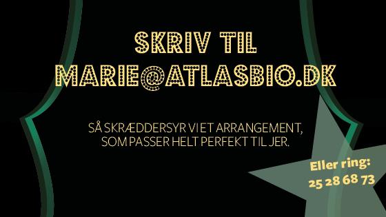 Vi er SÅ glade for, at vi valgte at holde det hos jer i ATLAS Biograferne. Jeres sans for detaljer og service var virkelig rørende, og hele jeres crew var en kæmpe hjælp. Vi har fået så fine tilbagemeldinger. Stor tak til hele holdet – der var styr på det hele, og det gjorde os rolige og trygge.”